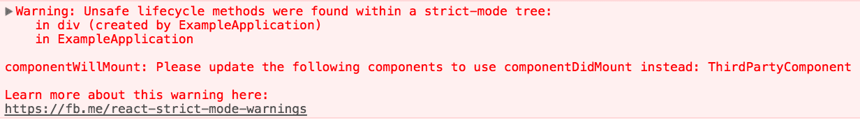 Cuando el modo estricto está habilitado, React reúne en una lista todos los componentes de clases que están usando ciclos de vida inseguros, y registra por medio de un mensaje de advertencia la información sobre estos componentes, de esta forma: